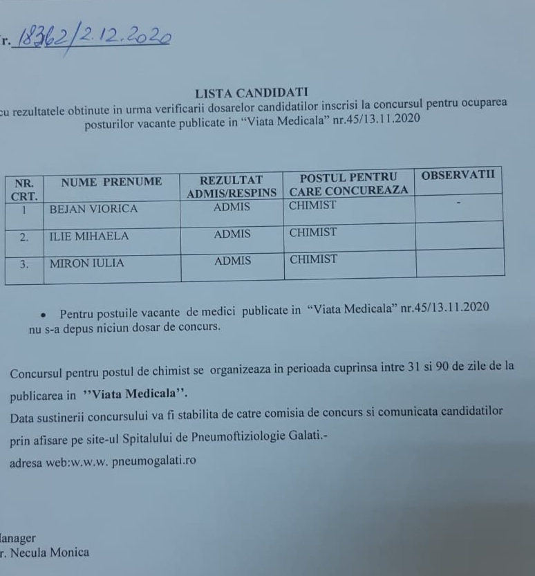 SPITALUL DE PNEUMOFTIZIOLOGIE GALATI scoate la concurs in conformitate cu prevederile O.M.S. nr.869/2015, cu modificarile si completarile ulterioare :